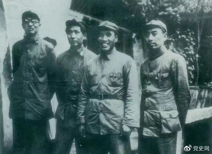 ▲1937年8月22日至25日,中共中央在陜北洛川馮家村舉行政治局擴大會議(即洛川會議)。圖為毛澤東和朱德、周恩來、林伯渠的合影。